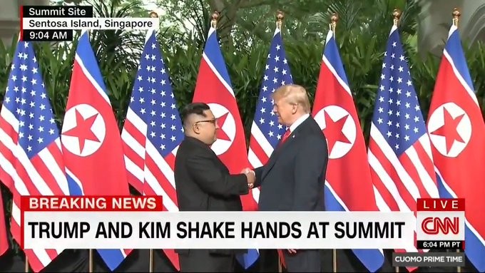 tribune.gr/ Με μία χειραψία μεταξύ των δύο ηγετών ξεκίνησε η ιστορική σύνοδος κορυφής του Αμερικανού προέδρου Ντόναλντ Τραμπ και του Βορειοκορεάτη ηγέτη Κιμ Γιονγκ Ουνστο ξενοδοχείο Capella στο νησί Σεντόκα της Σιγκαπούρης.Χαμογελαστοί οι δύο άνδρες χαιρετήθηκαν με φόντο τις σημαίες των χωρών τους πριν βαδίσουν μαζί πάνω στο κόκκινο χαλί, ανταλλάσσοντας μερικές φράσεις.